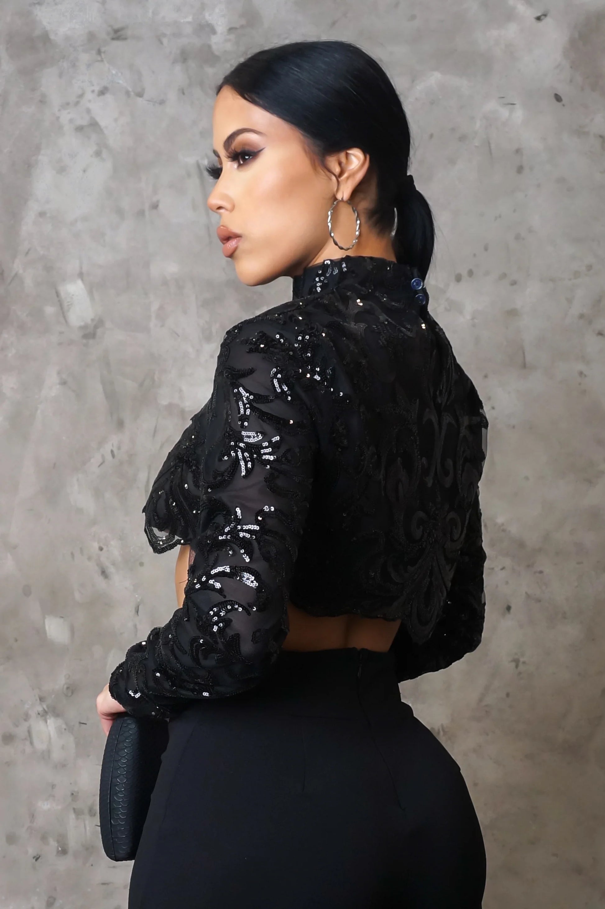 This sparkle detail crop top has long sleeves with a under lining for comfort, this top is sure to turn heads.